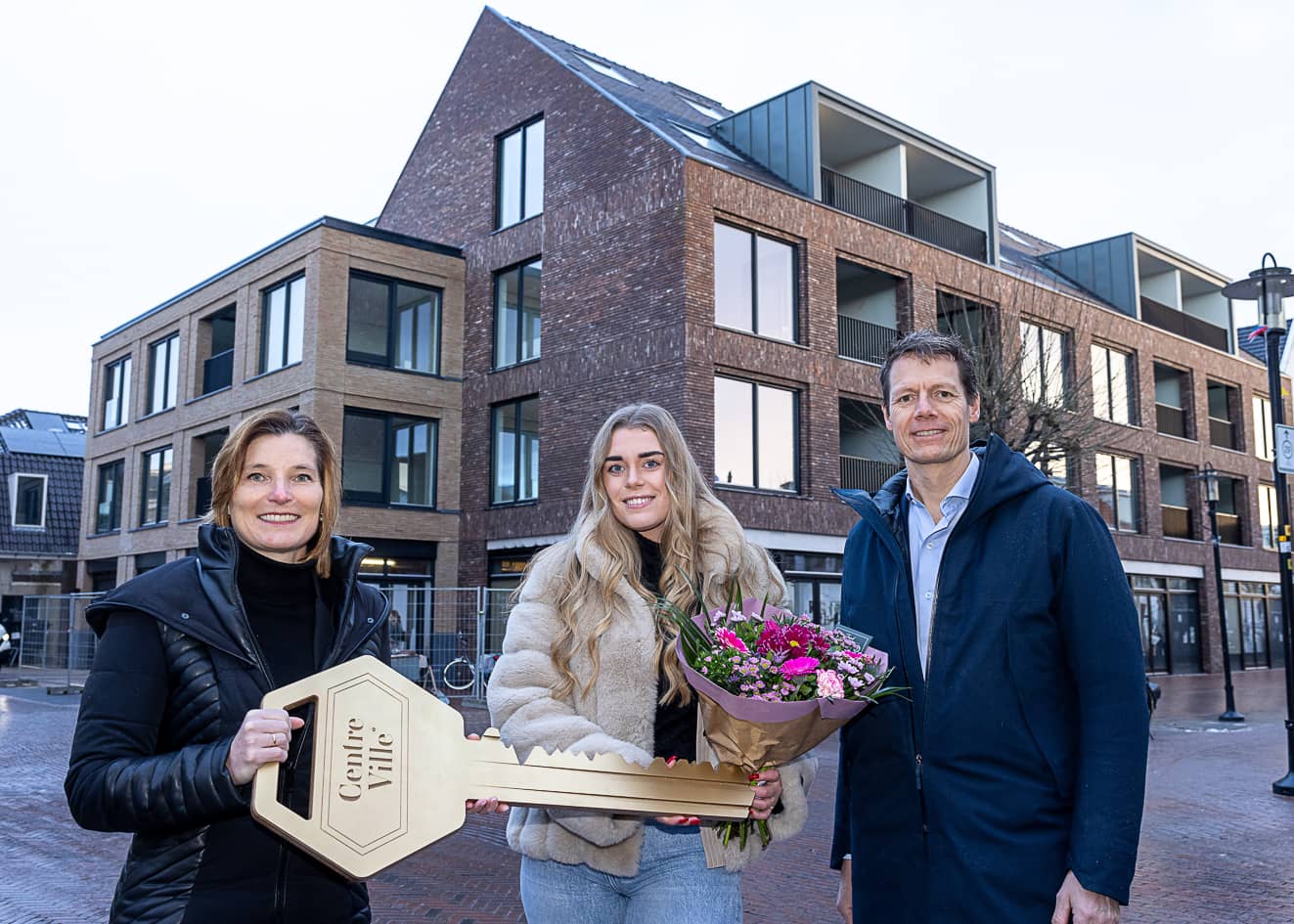 Centre Ville, the new apartment complex on the corner of Kanaalstraat and Heereweg in Lisse, is ready for delivery. On Friday 19 January, the symbolic handover of keys took place between Alderman Jolanda Langeveld, Olaf Nieuwenhuis of Kroonenberg Groep and Kim van der Kroft, the proud new owner of one of the flats. The handover signaled the start of project delivery.