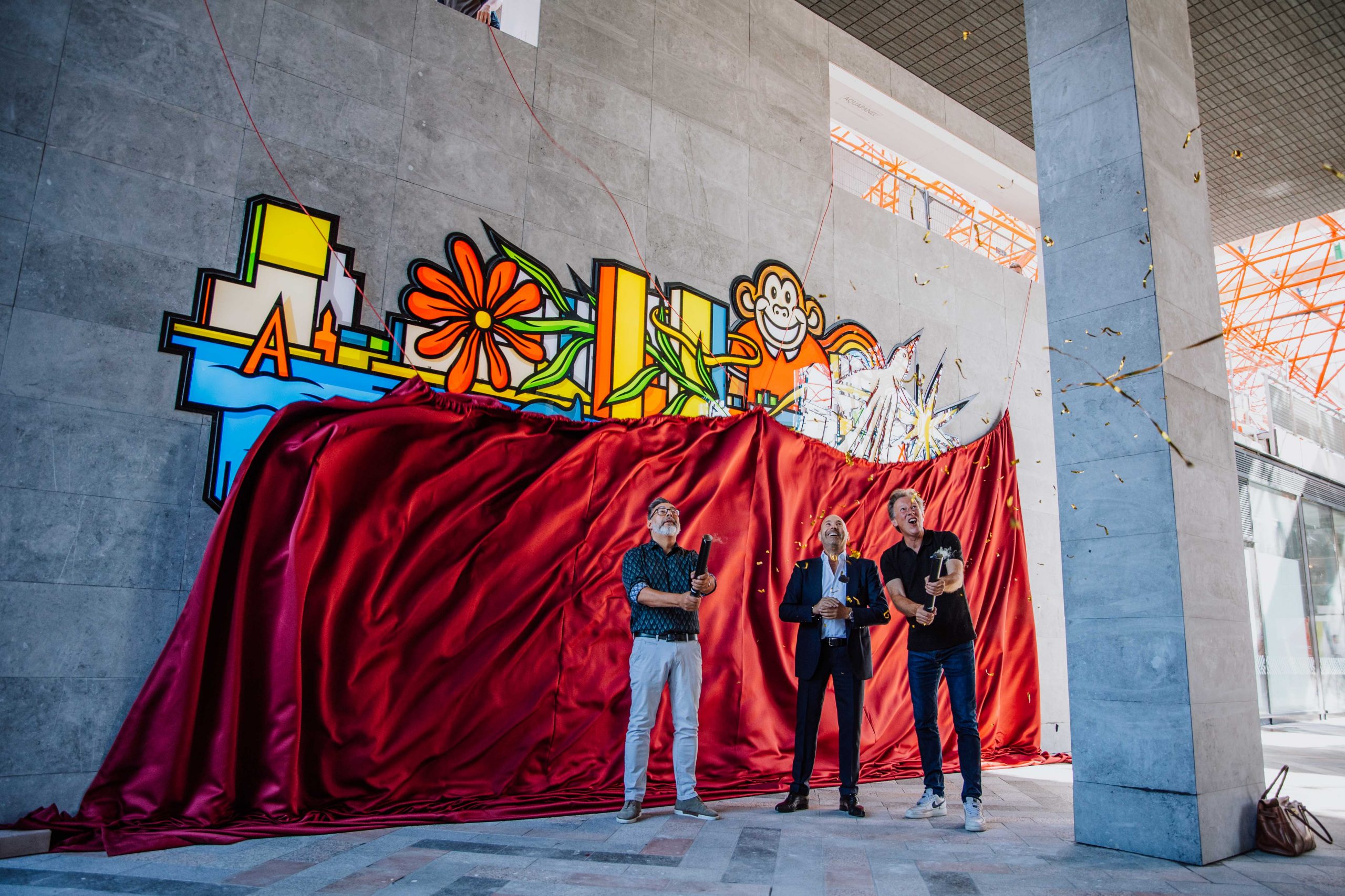 Tijdens een feestelijk moment hebben Lesley Bamberger (CEO Kroonenberg Groep) Danny Louwerse (Gemeente Almere) en Jeroen Everaert (Mothership) het kunstwerk Stad op waterspiegel onthuld. Het werk moet een beleving zijn voor het winkelende publiek, de bewoners van de omliggende woningen en de passanten van het station. Het kunstwerk vertelt het verhaal van Almere en is onderdeel van de Zeegroene loper, bedacht door Mothership.