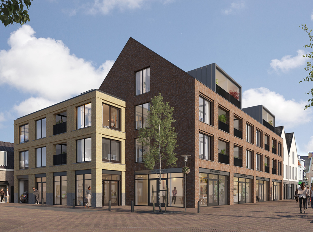 In tegenstelling tot het oude gebouw dat op deze locatie stond, is dit nieuwe complex goed verankerd in de omgeving. Geen blokkendoos maar variƫteit in volumes, details en kleurgebruik. De ruimtes zijn licht, met veel glas in de gevel. Zo zorgen we voor de levendigheid die bij een winkelstraat hoort.