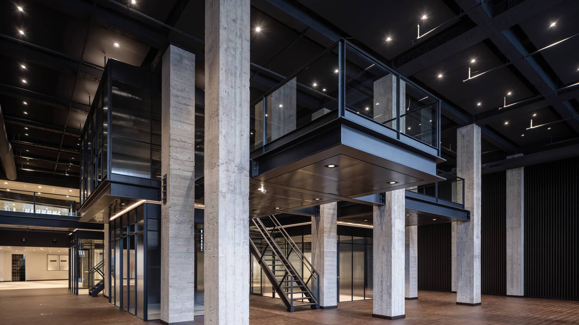 Betonnen zuilen, een stalen constructie met bruggen en trappen, marmer en donkere kopshouten vloeren combineren moderne zakelijkheid met het sfeervolle industriële karakter van weleer. De Pershal is in ere hersteld en getransformeerd tot spectaculaire kantoorlocatie. Een werkomgeving, die de gebruikers zal inspireren. Daglicht valt verrassend diep de ruimte in. Het komt van bovenaf, via de vroegere etalages of vanuit de oude stegen die zo kenmerkend zijn voor de Amsterdamse binnenstad. De monumentale natuurstenen publieksentree is gerestaureerd en binnen doorgetrokken als toegang tot een opeenvolging van unieke plekken.